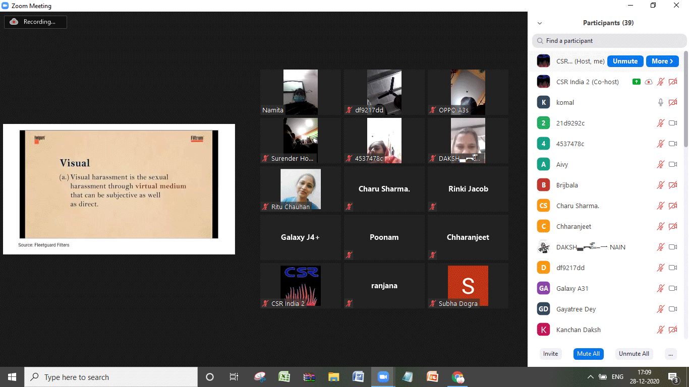 Given the unprecedented times, similar training had to be conducted via the online medium for the Reserve Bank of India’s (RBI) newly inducted staff of the Office and members of Society for the Promotion of Indian Classical Music and Culture Amongst Youth (SPIC MACAY). The first half of the training dealt in gender concepts and the second half dealt with the Sexual Harassment of Women at Workplace (Prevention, Prohibition and Redressal) Act (2013). Dr. Manasi Mishra also shared a few case studies with the participants which have been discussed and briefed upon. The outcomes of the trainings were enhanced awareness of the law and an open forum discussion on gender equality and sexual harassment.