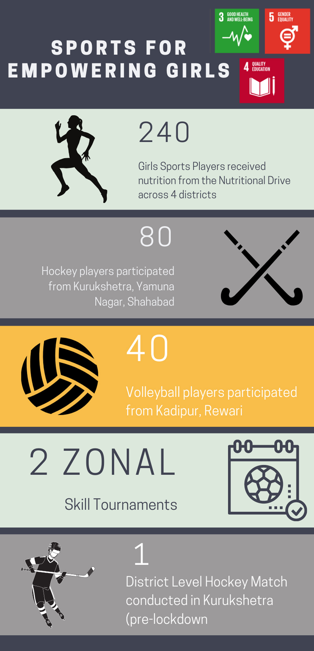 In the Month of June as India was eventually unlocking, our team had reached out to the District Sports and Youth Affair Officers to assist us in resuming the distribution of nutritional intake to players. Our continuous efforts helped us to successfully resume the nutritional intake in 4 out of 5 districts, i.e. Gurugram, Kuruskhetra, Jhajjar and Mahendragarh for 250 girls’ hockey and volleyball players. We were also able to conduct two zonal level competitions in the Gurugram and Kurukshetra districts. Both the events received great appreciation from the district sports authorities and the participants. At the Kurukshetra Zonal Sports meet, former international hockey players Mrs. Harjinder Kaur and Ms. Meenakshi graced the occasion to motivate and felicitate the players. The team and coaches conducted these activities by carefully following all safety guidelines for COVID-19.
